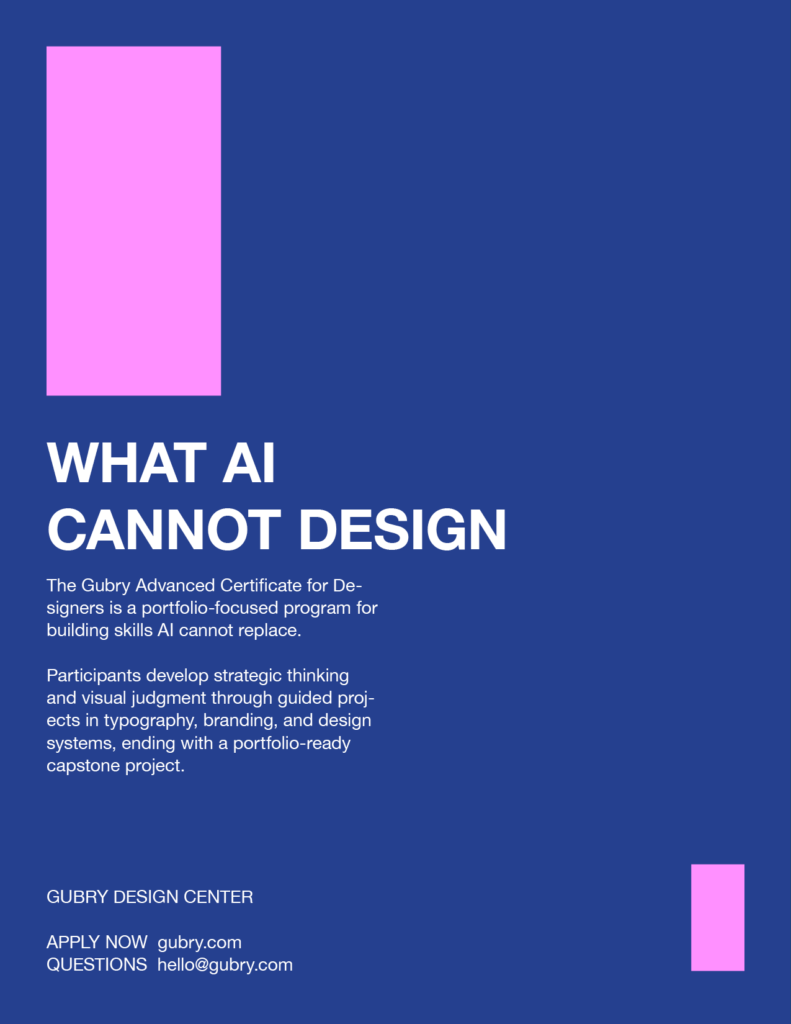 The program moves beyond automated outputs by centering on how design decisions are made—teaching the hierarchy, systems, and visual logic required to shape meaning, insight, and genuine connection.